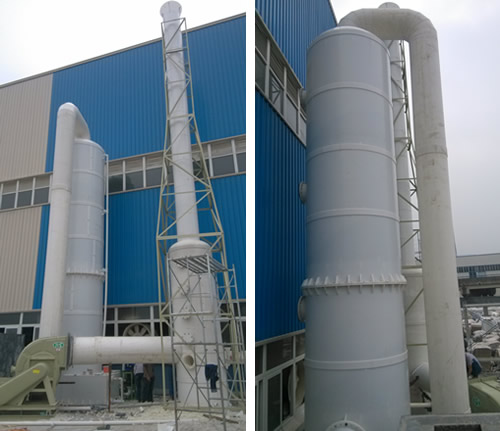 預(yù)處理塔處理后的廢氣經(jīng)塔底下方進(jìn)口進(jìn)入后進(jìn)入首層填料(5-7cm的鵝卵石)和噴淋層,然后再進(jìn)入二層填料(5cm陶瓷鮑爾環(huán))和噴淋層,隨后在進(jìn)入三層填料(3cm陶瓷鮑爾環(huán)),再由設(shè)置在末端的氣液分離層去除水分,使治理后的廢氣達(dá)標(biāo)排放。